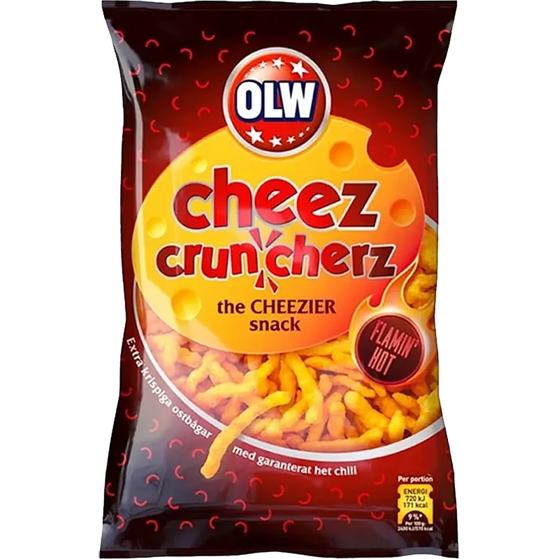 OLW Cheez Cruncherz® Hot Chili are not your average cheese snacks. Made from high-quality corn flour and sunflower oil, each curl is generously coated with a blend of cheese powder and spicy chili seasoning. The result is a snack that's bursting with flavor and delivers a satisfying crunch in every bite.